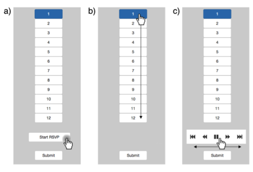 We found the “Hover” method to be the fastest, and that “Slide Show” and “Velocity Control” are no better than “Point and Click”. We did not find significant differences between the groups with regard to accuracy. This supports our hypothesis that accuracy is not compromised when using RSVP for visual search.