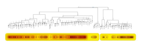 This tool visualizes each node of a phylogenetic tree as a point on a two-dimensional map, with the placement, surrounding color, and distance from other nodes determined by its attraction to parent and sister nodes, branch length, and hierarchical level. Topographic contour shapes indicate which level nodes are connected at. Gaps between clusters indicate clades from a different lineage.